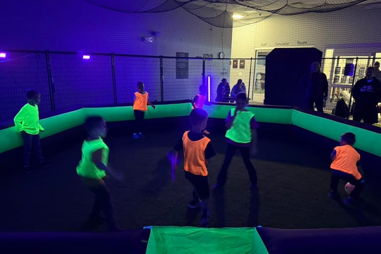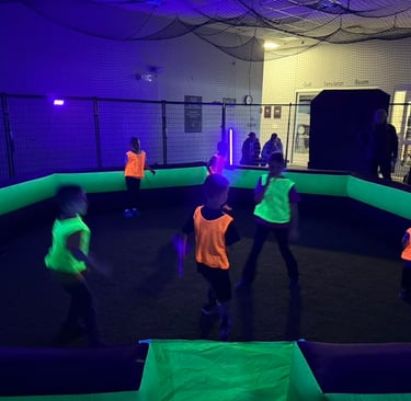 1 hour of turf time for a variety of games that include: Assortment of Glow Games, Real Life Angry Birds, Dodgeball, Glow Battle Games, and a variety of Large Yard Games.